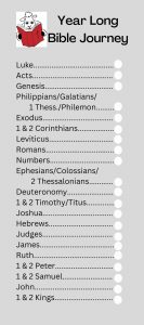 We have created a handy bookmark that identifies the order of Books of the Bible we will use in our year long journey.